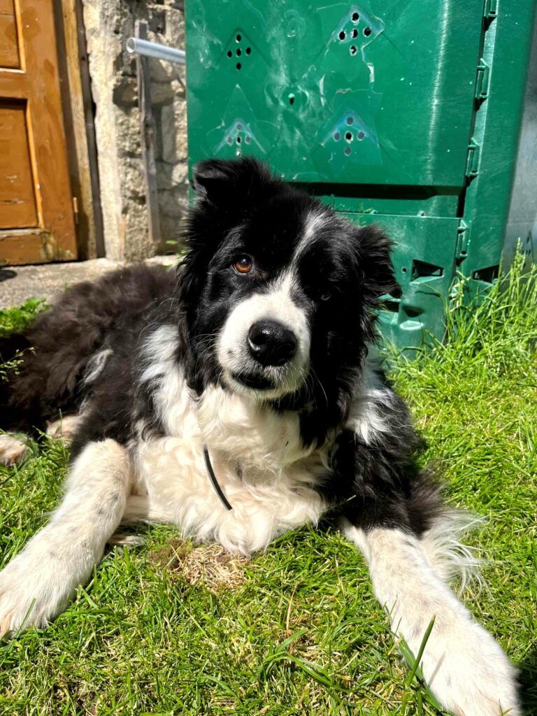 Das ist Fly. Sie ist eine weiß-schwarze Broder Collie Dame. Fly liebt es zu kuscheln und gestreichelt zu werden, sie ist daher ein Familienhund mit sehr großen Herz.